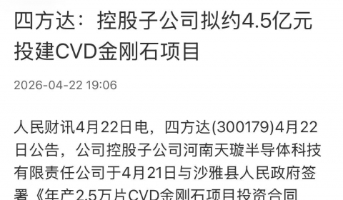 2026年4月20日,位于江苏省高邮经济开发区的扬州力量钻石有限公司,下线了首颗培育钻石。这不仅是企业自身的节点,也意味着扬州市在超硬材料产业上实现了“从零到一”的突