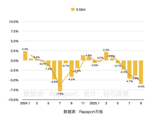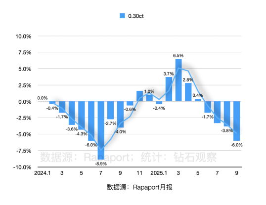 ▲ 图源:Rapaport 价格变化 四个重量板块的 RAPI 价格指数都呈现了不同程度的下降,其中0.30克拉和0.50克拉的承压比上个月更加严重,1.00克拉降价幅度略微缩小,3.00克拉板块的价格未出现变化。具体情况如下: · 0.30克拉:-6.0%(8月-3.8%) 与去年同期相比,四个重量板块的表现如下: · 0.30克拉:-0.2%