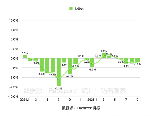 据 Rapaport 今天发布的2025年9月天然钻石裸钻价格报告显示,钻石价格再一次下降,其中1.00克拉以下的小颗粒圆形钻石降价较为明显。 “美国关税政策等事宜,让市场持续笼罩在不确定性之中。”