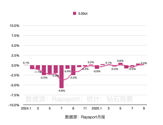 ▲ 图源:Rapaport ⚠️上表的统计样本是D-H色、IF-VS2净度等级的圆钻 综合观察自2024年1月至2025年9月的各板块价格变化情况(如下图),可以看到小颗粒(0.30ct、0.50ct)板块的表现并不理想,1.00ct板块趋于稳定,而3.00ct的表现最佳。 从某种程度上讲,这反映了天然钻石“逐渐向某一个细分市场不断聚焦”的趋势。