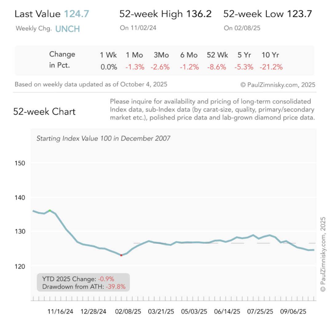 ▲ 天然钻石毛坯钻价格指数变化 截至时间:2025年10月4日 图源:Paul Zimnisky 以上内容请谨慎参考 本文封面图源自网络,无任何商业用途 本文来源:钻石观察 |