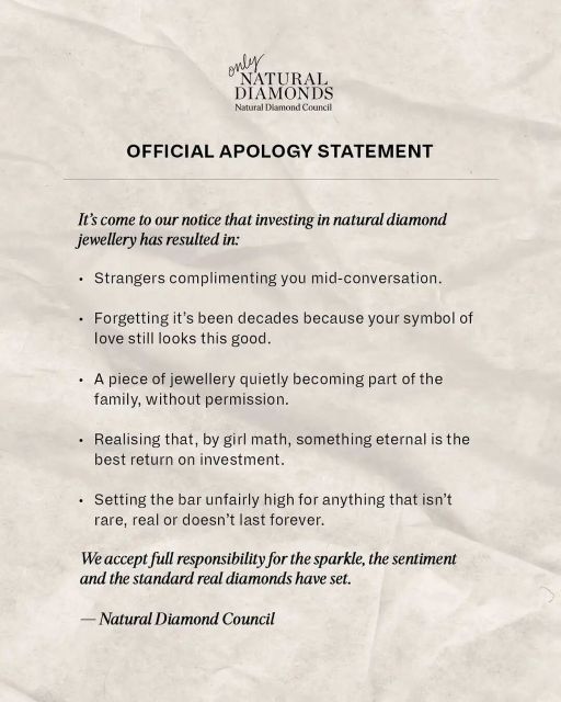 也许这真的成为了一种在钻石珠宝圈里的“潮流”,因为就连我们熟悉的天然钻石协会(NDC)也加入了“道歉营销”的队伍: