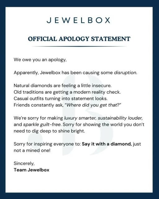 ▲ 来自Jewelbox的“道歉信”我们很抱歉,让奢华变得更明智,让可持续理念更响亮,让闪耀无负担。抱歉向世界证明:无需深挖地球,也能闪亮动人。抱歉激励了每一个人:用钻石表达心意,但不必用开采的钻石!前天,当 ...