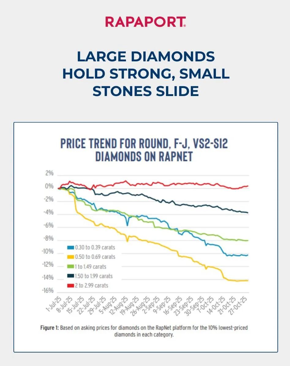 Martin Rapaport 昨天公开发表的一段评论,还是挺有意思的。他认为:钻石市场的分化已成定局。Rapaport近期研究显示,钻石市场表现的分化正在加剧:- 大颗粒钻石(2-3克拉)的价格在供应趋紧和需求强劲的支撑下保持 ...