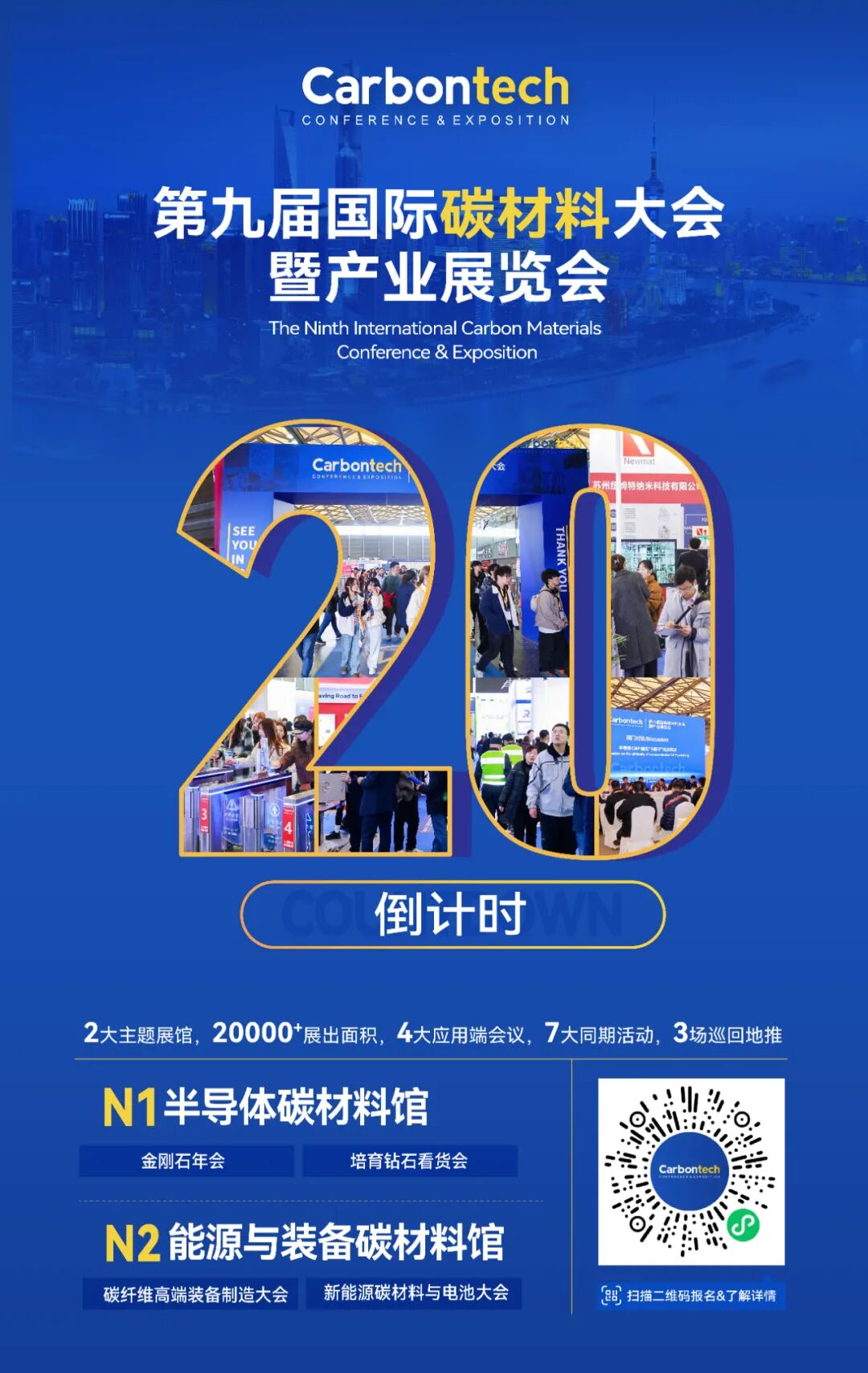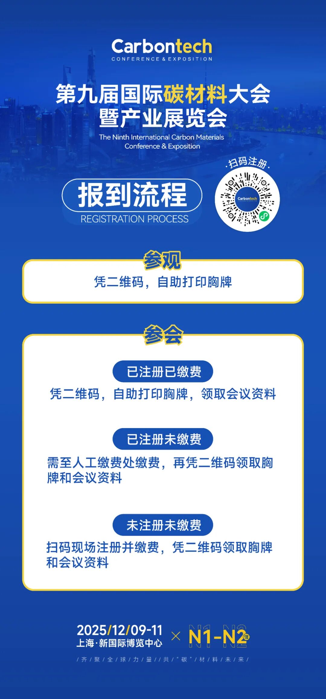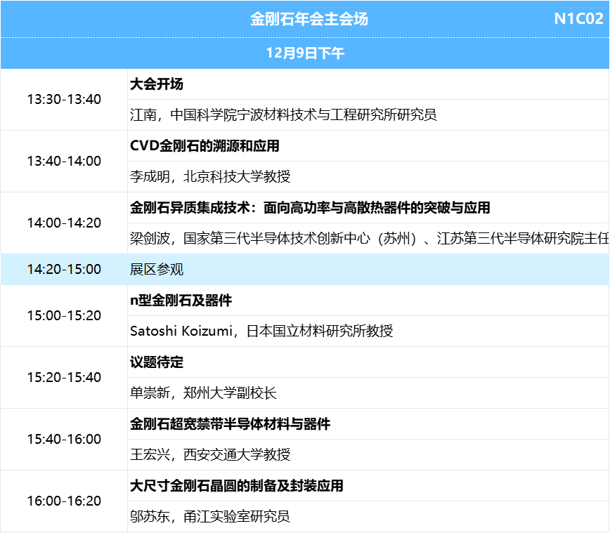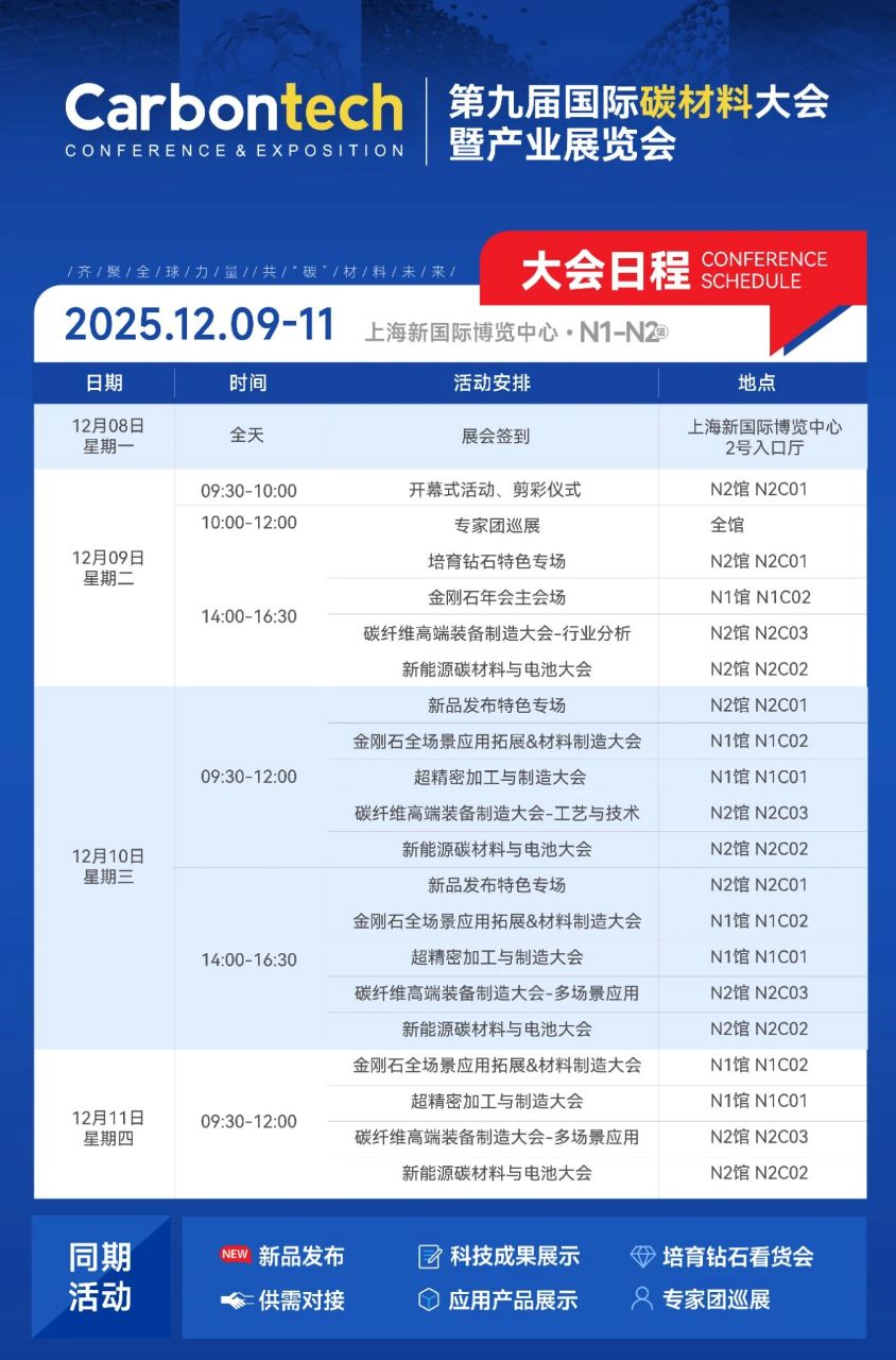 展会名称:Carbontech 2025第九届国际碳材料大会暨产业展览会 展会主题:材料创新驱动产业变革 展会时间:2025年12月9-11日 展会地点: 展馆分布:N1半导体碳材料馆、N2能源与装备碳材料馆 应用大会:2025金刚石年会(金刚石全场景应用拓展&材料制造大会、超精密加工与制造大会)、碳纤维高端装备制造大会、新能源碳材料与电池大会 同期活动:新品发布、供需对接、科研成果展示、应用产品展示、培育钻石看货会、专家团巡展...... 组织机构 名誉主席:薛群基,中国工程院院士 主办单位:DT新材料 联合主办:中国超硬材料网 协办单位:金刚石激光技术及应用协同创新中心、碳纤维研习社、铭炭网活性炭 支持单位:CVD Diamond Film Group、北京石墨烯研究院有限公司、重庆市石墨烯产业技术创新联盟、广州钻石交易中心、上海钻石行业协会、国际粉体检测与控制联合会工业应用委员会、湖南省新材料产业协会、清华大学天津高端装备研究院、深圳市龙岗区珠宝行业协会、陕西省碳/碳复合材料工程技术研究中心、西北工业大学碳/碳复合材料研究所、甬江实验室、中南大学炭/炭复合材料研究所、中国石墨产业发展联盟、中关村天合宽禁带半导体技术创新联盟、浙江省半导体行业协会、中国材料研究学会超硬材料及制品专业委员会、河南省培育钻石交易中心、中国地质大学(北京)郑州研究院、江西远东电池有限公司、国家车用超级电容器系统工程技术研究中心、上海奥威科技开发有限公司、上海碳纤维复合材料创新研究院 合作媒体:DT新材料、DT先进电池、DT半导体、DT钙钛矿、DT新能源、复材应用技术网、复合材料前沿、复合材料力学、高分子科学前沿、化工仪器网、化合物半导体、科学桥、沥青基碳材料、锂电前沿、培育钻石网、清新电源、石墨盟、先进半导体产业集群、先进电池材料产业集群、芯师爷、湾区半导体产业生态博览会、五会六展、上海有色网、协创微半导体、亚洲氧化镓联盟、炭碳论谈、ACT半导体芯科技、材料汇、材料分析与应用、电池能源与技术、碳纤维链、硅碳之家、南墅石墨矿、织物增强视界、芯半导体前沿 展馆平面图