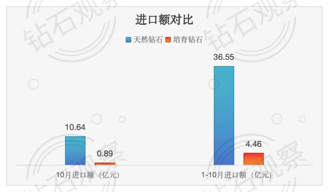 10月份 天然钻石(裸石)进口量 34.04万克拉,同比 +627.53%;进口额 10.64亿元,同比 +474.24%;进口均价 3125元/克拉,同比 -21.07%。 培育钻石(裸石)进口量 18.55万克拉,同比 +286.79%;进口额 0.89亿元,同比 +268.25%;进口均价 481元/克拉,同比 -4.79%。