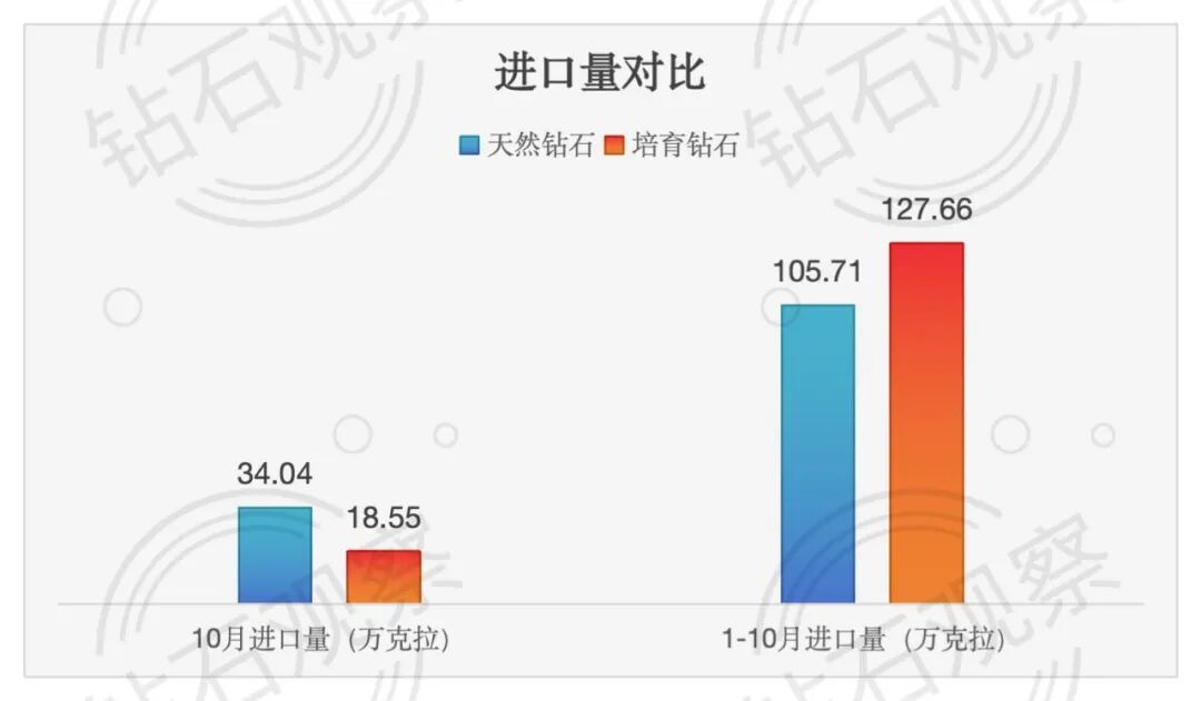 1-10月 天然钻石(裸石)进口总量 105.71万克拉,同比 +122.81%;进口总额 36.55亿元,同比 +86.59%,进口均价 3457元/克拉,同比 -16.26%。 培育钻石(裸石)进口总量 127.66万克拉,同比 +334.85%;进口总额 4.46亿元,同比 +125.99%;进口均价 350元/克拉,同比 -48.03%。 培育钻石市占率: 进口量(按克拉计):54.70%