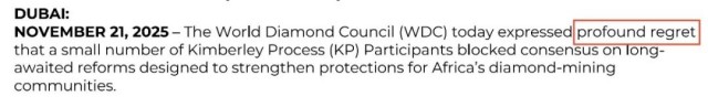 世界钻石理事会(WDC)对此深感遗憾,该组织的主席费里尔·泽鲁基(Feriel Zerouki)直言: “因追求不可能之事,导致进展被扼杀。” 尽管WDC未在声明中直接点明行使否决权的国家(和地区),但ADPA(非洲钻石生产商协会)毫不留情地指出了反对者,并严厉批评欧盟,称其近年来“故意模糊并多次试图绕过KP的工作”,凸显出各方在钻石行业规则制定上的政治分歧。