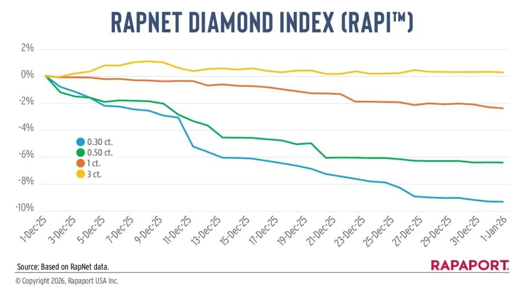据 Rapaport 昨天发布的2025年12月天然钻石裸钻价格报告显示,年底的钻石市场走势分化加剧:以1克拉为“分水岭”,小颗粒成品钻石的价格大幅下跌,而大颗粒的价格则保持坚挺。 其中0.30克拉和0.50克拉的单月降价幅度均超过了11月。