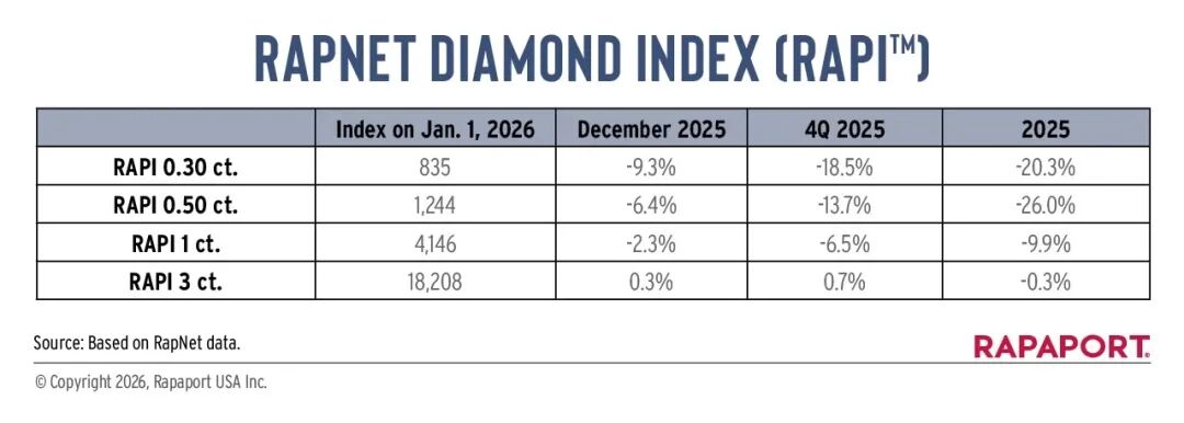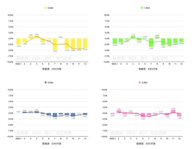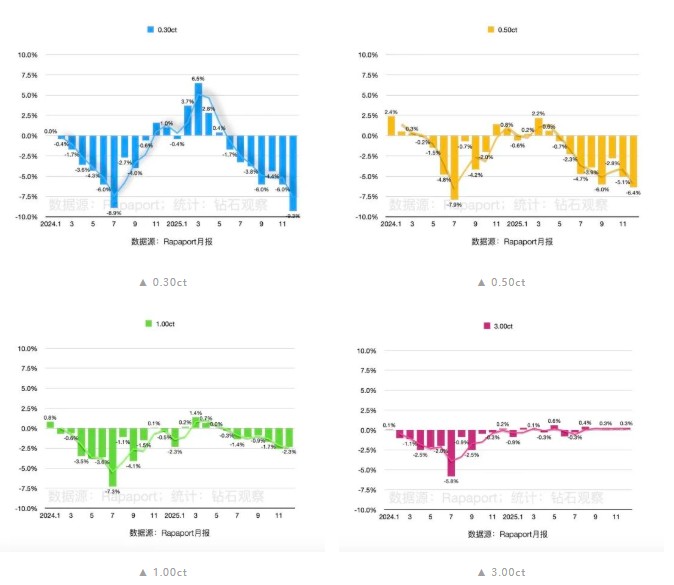 价格变化 四个重量板块的 RAPI 价格指数都呈现了不同的变化,其中0.30克拉、0.50克拉的降价幅度较上个月有所放大,3.00克拉板块的价格呈现正增长,且涨幅大于上个月。具体情况如下: · 0.30克拉:-9.3%(11月-6.0%) 综合2025全年,四个重量板块的表现如下: · 0.30克拉:-20.3%