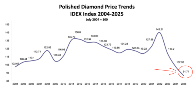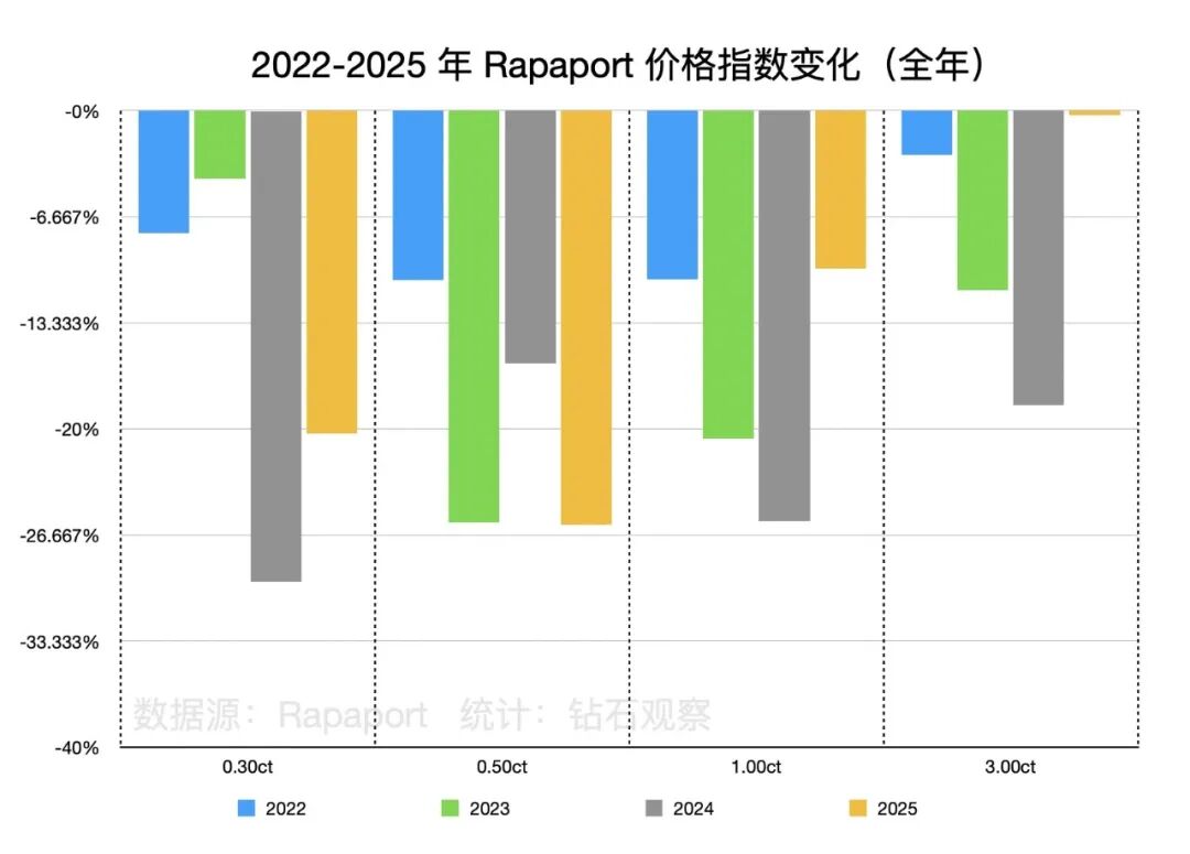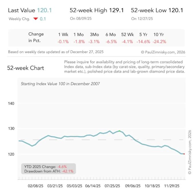 ▲ 天然钻石毛坯钻价格指数变化 截至时间:2025年12月27日 图源:Paul Zimnisky 以上内容请谨慎参考 本文封面图源自网络,无任何商业用途 本文来源:钻石观察 |