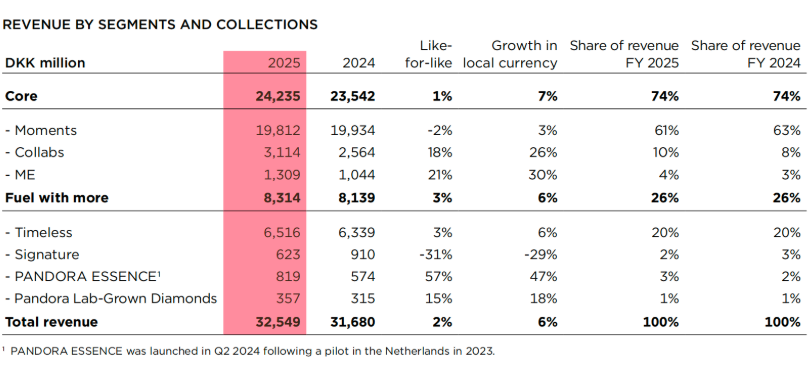 培育钻石被归类在"Fuel with more"细分市场,这个市场在2025年贡献了公司总收入的26%,实现了3%的同比增长。Pandora Timeless是这个细分市场的核心,占该细分市场的78%,而培育钻石则代表了公司在高端化方向的重要尝试。通过推出微细培育钻石系列,Pandora正在扩展其在培育钻石领域的野心,试图在保持"珠宝背后的意义"这一品牌核心DNA的同时,向更高价值的产品类别延伸。