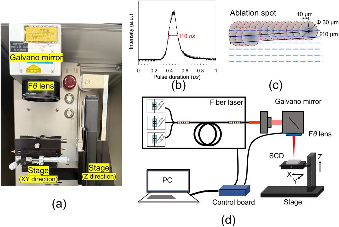 金刚石因其优异的导热、电学与光学性能,在高功率器件、热沉及红外窗口等领域具有广阔应用前景。然而,其极高硬度和脆性也使大尺寸衬底的高精度加工极具挑战。 近年来,纳秒激光预处理结合等离子体辅助抛光(PAP)逐渐成为主流技术路线:前者用于快速去除低频形貌起伏,后者实现原子级表面精修。但激光属于典型的热烧蚀过程,不可避免在材料表面形成热影响区,这一结构对后续抛光效率与最终表面质量具有关键影响。 近日,日本大阪大学在《Diamond & Related Materials》发表题为《Physical properties and polishing characteristics of laser induced heat affected zone on diamond surfaces》的研究论文。围绕激光加工后金刚石表面热影响区(HAZ)的结构特征及其抛光行为展开了系统研究,为金刚石高效精密加工提供了重要理论支撑。 研究团队采用1064 nm、110 ns脉冲的纳秒激光系统(功率12 W,扫描速度400 mm/s,线间距10 µm),在5 mm×5 mm的CVD单晶金刚石(001)表面进行轮廓加工。为增强吸收,先沉积约100 nm金膜,激光后表面残留石墨层,再通过氧等离子体刻蚀(400 °C、200 W、10 min)暴露HAZ。 研究表明,激光诱导的HAZ并非简单单层结构,而是由“损伤层—过渡层—本体金刚石”构成的分层体系。其中,最表层损伤层厚度约为数百纳米,晶体结构明显退化;其下为厚度约2.9 μm的过渡层,晶体质量随深度逐渐恢复;再向内则为未受影响的本体金刚石区域。 值得关注的是,该研究给出了一个具有重要工程意义的结论:一旦表层损伤层被去除,过渡层的晶体结构可以完全恢复至接近本征状态。抛光后表面拉曼峰恢复至无应力位置,峰宽显著收窄,说明过渡层中的晶格畸变主要为弹性变形而非不可逆损伤。这意味着,真正需要重点控制和去除的,仅是表层数百纳米范围内的损伤层。 基于上述认识,激光+PAP复合工艺的优化路径也逐渐清晰。一方面,通过合理控制激光能量、扫描参数与热输入,可降低HAZ厚度及损伤程度;另一方面,利用PAP对损伤层进行高效剥离,并实现后续精密修复,可显著提升整体加工效率。已有研究表明,该复合工艺可将大尺寸单晶金刚石的抛光时间从约200小时缩短至30余小时,展现出较强的产业应用潜力。 总体来看,该工作系统揭示了激光诱导热影响区的结构本质及其在抛光过程中的演化规律,将过去被视为“不可避免副作用”的HAZ转变为“可调控加工单元”。随着金刚石在半导体散热、高功率电子器件等领域应用的持续拓展,对加工损伤与界面质量的精细控制将愈发关键,而围绕HAZ的深入研究无疑将成为推动金刚石工程化应用的重要一环。 图文导读 ![]() 图1. (a) 激光系统照片,(b) 激光脉冲持续时间,以及 (c) 用于在金刚石表面制备激光诱导热影响区(HAZ)的烧蚀实验所采用的扫描模式。(d) 激光系统示意图。
