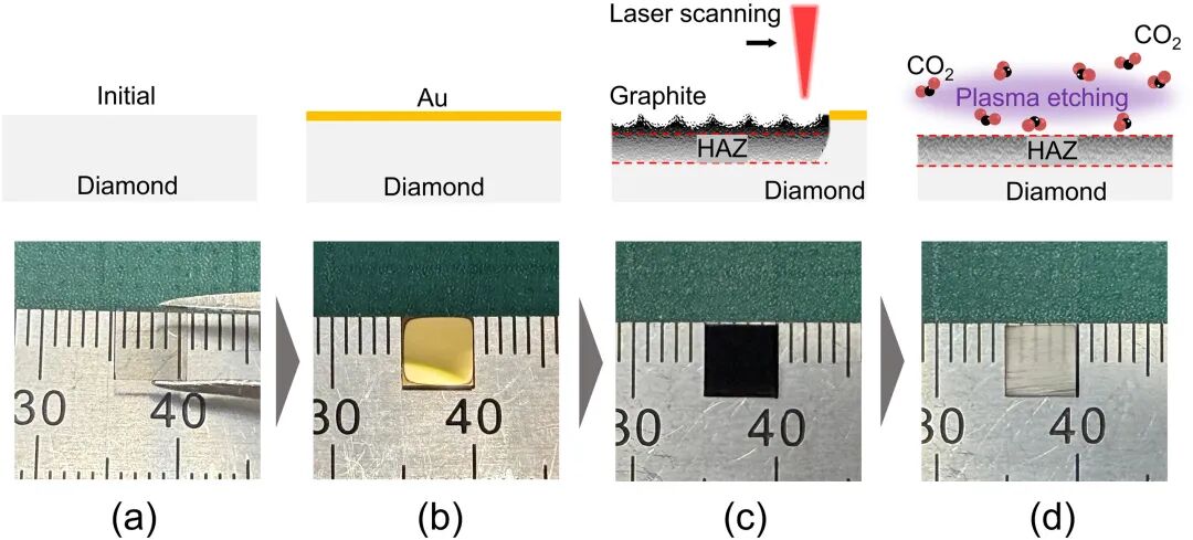 图2. 在SCD表面制备激光诱导热影响区:(a) 初始5毫米SCD基板,(b) 镀金表面,(c) 激光烧蚀后的表面,以及(d) 等离子体刻蚀去除石墨层并显露顶部表面的热影响区。 以上内容请谨慎参考 本文封面图源自网络,无任何商业用途 本文来源:DT半导体 |