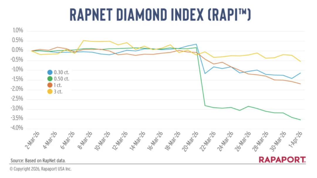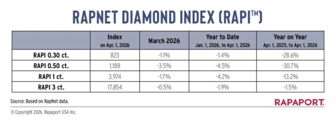 据 Rapaport 发布的2026年3月天然钻石裸钻价格报告显示,该月的钻石价格在持续下降的基础上呈现明显的分化态势,其中0.5克拉板块的价格指数在3月下旬出现急剧下跌。受中东局势的影响,以色列与迪拜的钻石交易陷入停 ...