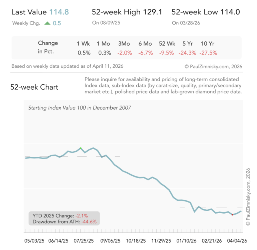 - 天然钻石毛坯价格 - ![]() ▲ 天然钻石毛坯钻价格指数变化 截至时间:2026年4月11日 图源:Paul Zimnisky